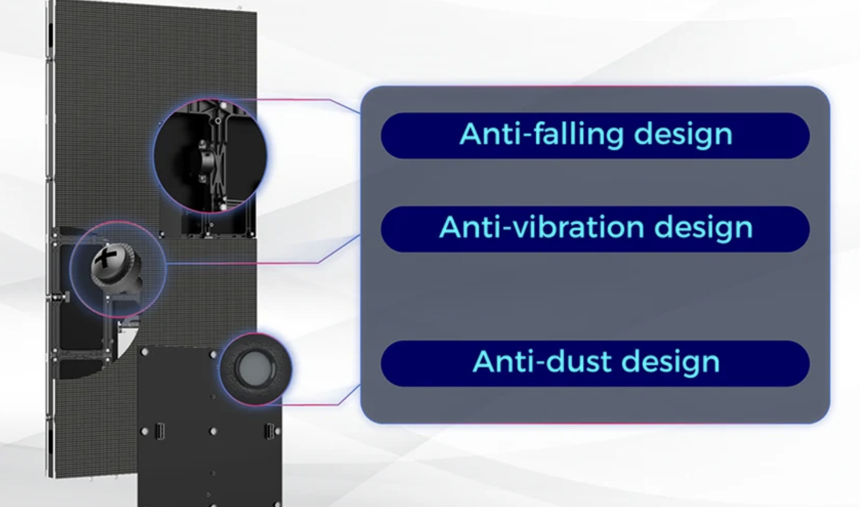 – Ступенчатое включение экрана, Антивибрационная шайба и предохранительный трос от падения, конструкция тройной защиты.